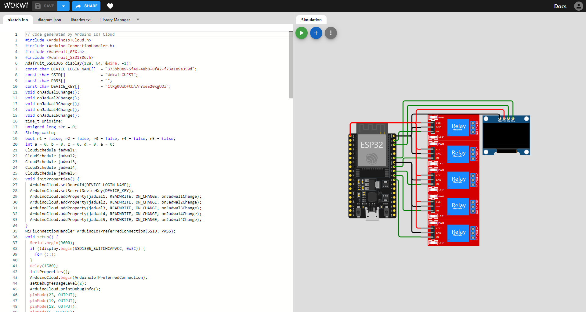 아두이노 IoT 클라우드를 사용하여 ESP32(웍위 시뮬레이션)에 연결된 OLED 디스플레이로 5개의 릴레이를 예약 제어하는 방법은 무엇인가요? 단계는 다음과 같습니다: