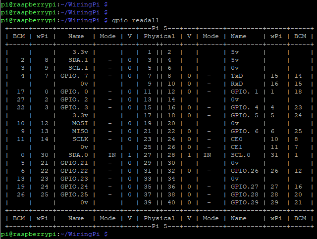gpio 도구를 사용하면 단일 핀을 설정할 수 있을 뿐만 아니라 모든 핀의 상태를 한 번에 확인할 수 있습니다: