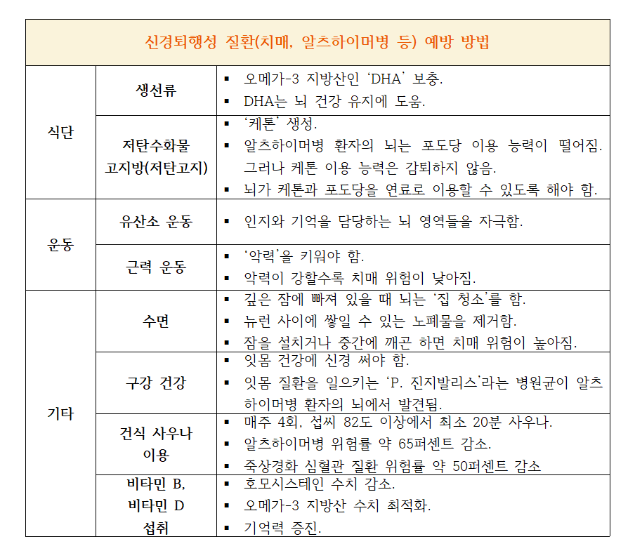'신경퇴행성 질환 예방 방법'을 읽고, 표로 정리해보았습니다. 이미지 출처는 X - @lllee94
