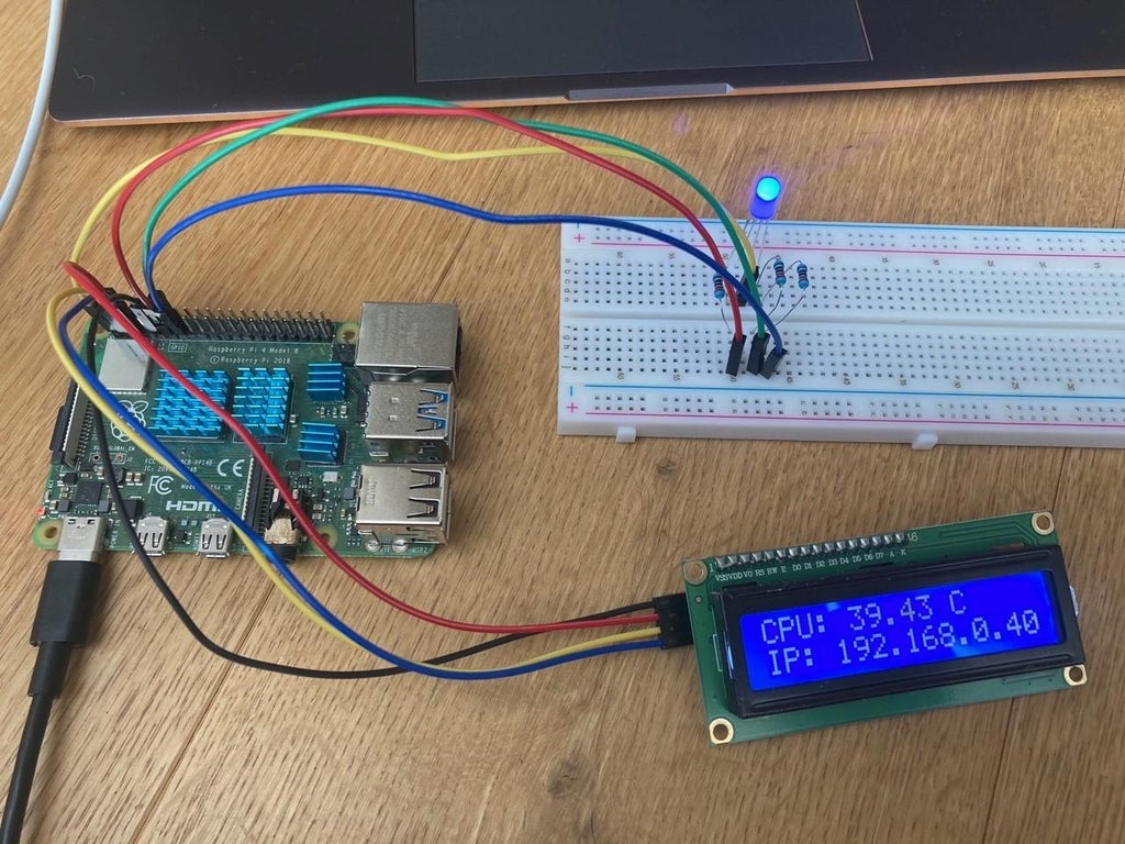 저는 라즈베리 파이를 사용하는 동안 LCD1602 디스플레이 화면을 사용하여 IP 주소와 CPU 온도를 표시하여 라즈베리 파이가 튀지 않도록 하고 싶었습니다. LCD 화면은 16열에 두 줄의 문자만 표시할 수 있기 때문에 제한이 있어서 저는 "CPU" 텍스트만 표시하기로 했습니다: " 및 "IP:"와 해당 데이터만 표시하기로 했습니다. 디스플레이는 I2C 인터페이스를 사용하여 직렬 입력 및 병렬 출력 모듈을 화면에 연결하므로 LCD를 작동하는 데 필요한 전선은 4개뿐입니다. 직렬-병렬 IC 칩은 코드에서 참조할 수 있는 기본 I2C 주소(0x27)를 가진 PCF8574T입니다. 브레드보드, RGB LED, 전선, 저항기, LCD, 라즈베리파이가 필요합니다.