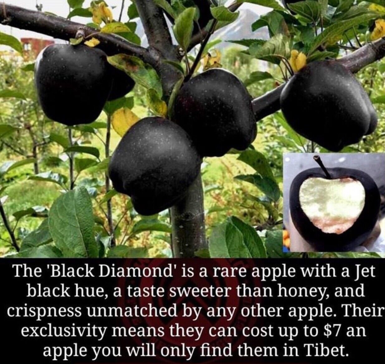 블랙 다이아몬드 사과는 티베트 닝치 지역에서 재배되는 화니우 사과과에 속하는 희귀 품종입니다. 이름에서 알 수 있듯이 사과는 보라색을 띠며 안쪽에는 하얀 과육이 있습니다. 이 사과의 독특한 색은 이 지역의 고도가 높기 때문입니다.