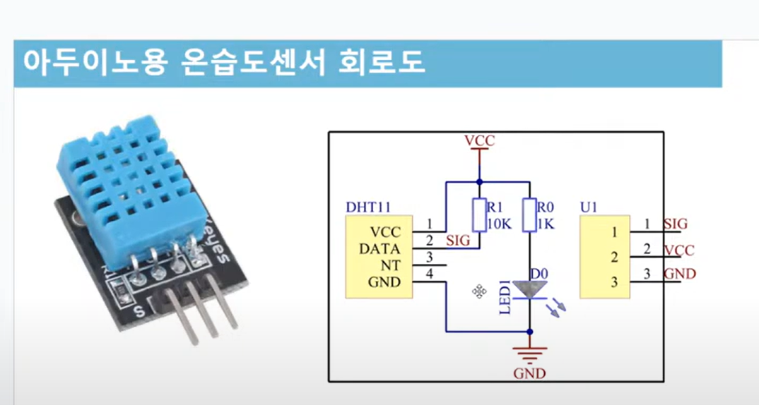 아래 회로도를 보면 오른쪽 3핀은 모듈 출력으로 아두이노에 연결되는 핀 3개이고 나머지는 온습도 센서 DHT11을 구성하는 회로다. 모두가 방식은 같다.