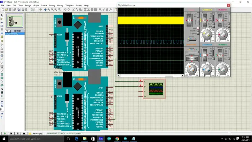 위의 코드를 사용하여 핀 D3의 주파수를 변경해 보겠습니다. 이 회로는 프로테우스 소프트웨어에서 시뮬레이션됩니다.