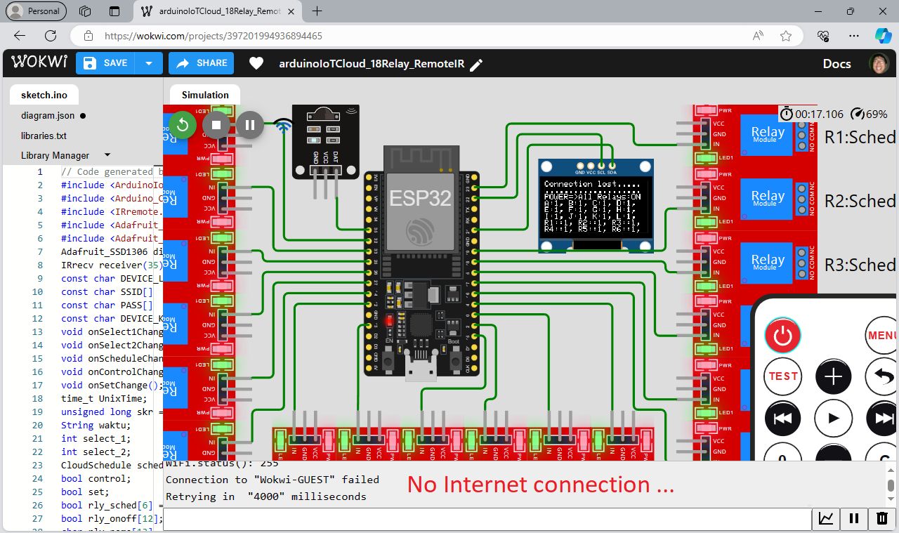 3. 인터넷이 없는 시뮬레이션을 하려면 Wokwi 프로그램의 ID와 비밀 키 코드를 변경하지 않아야 합니다. Wokwi 시뮬레이션을 실행합니다. 아두이노 IoT 클라우드의 장치 상태는 여전히 오프라인 상태여야 합니다. IR 리모트 버튼을 하나씩 누르면 IR 리모트가 18개의 릴레이를 모두 제어할 수 있어야 합니다.