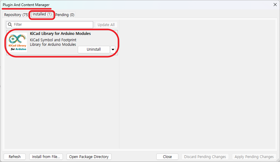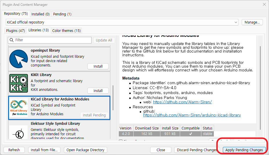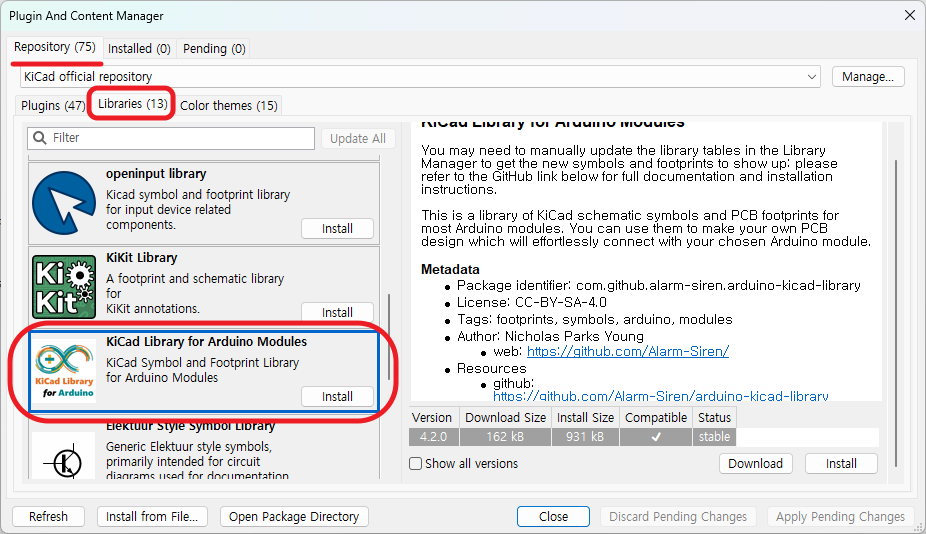 - Go the Libraries tab and locate the "KiCad Library for Arduino Modules" in the list.