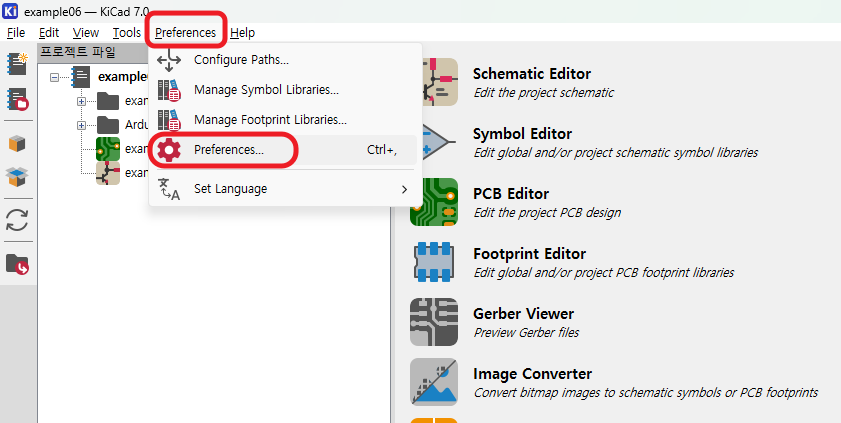 1. KiCad를 열고 "기본 설정" -> "기본 설정..."에서 기본 설정 창을 엽니다.