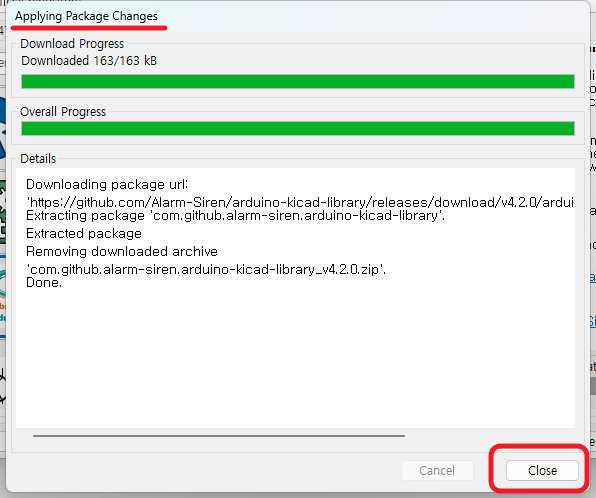 12. 완료되면 "패키지 변경 사항 적용" 창을 닫습니다.