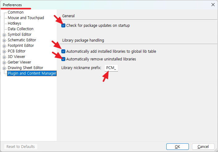 3. "설치된 라이브러리를 글로벌 라이브러리 테이블에 자동으로 추가" 옵션이 선택되어 있는지 확인합니다.