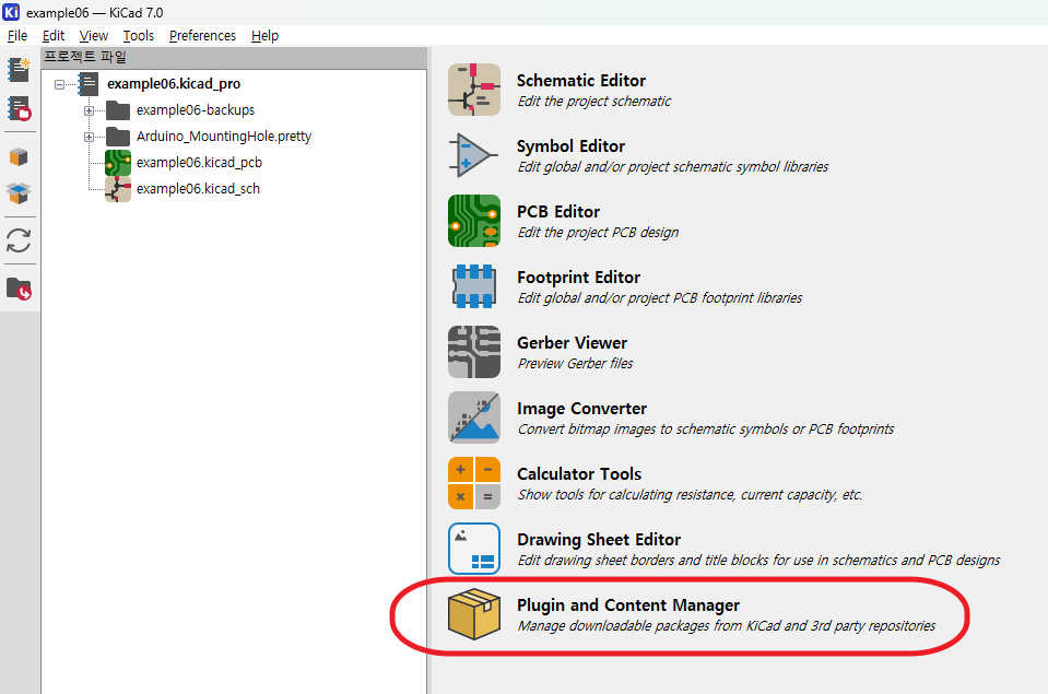 1. KiCad 닫으시고 다시 실행합니다. 예제를 하나 만드시고