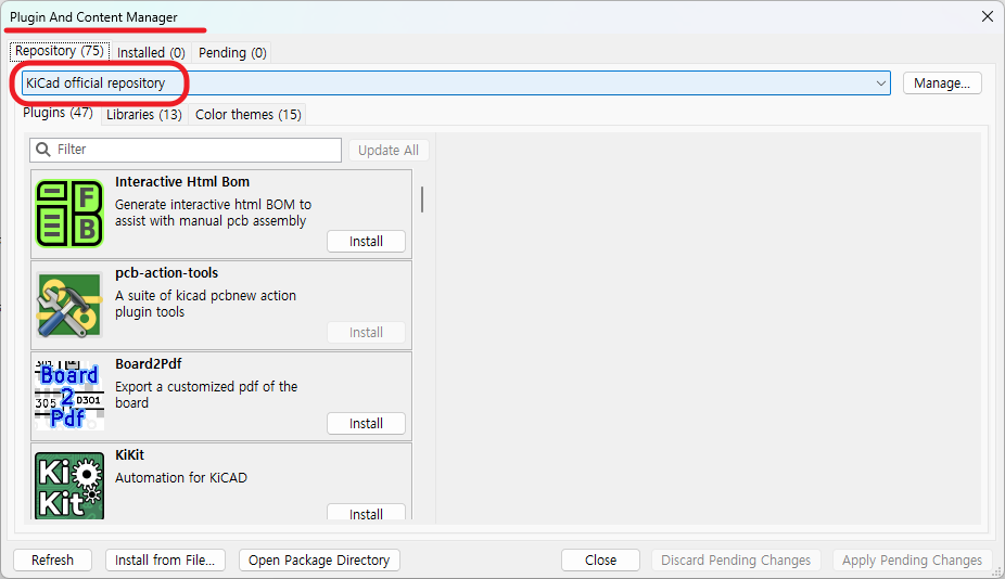 8. 상단 드롭다운 상자에서 "KiCad 공식 리포지토리"를 선택합니다(아직 선택하지 않은 경우).