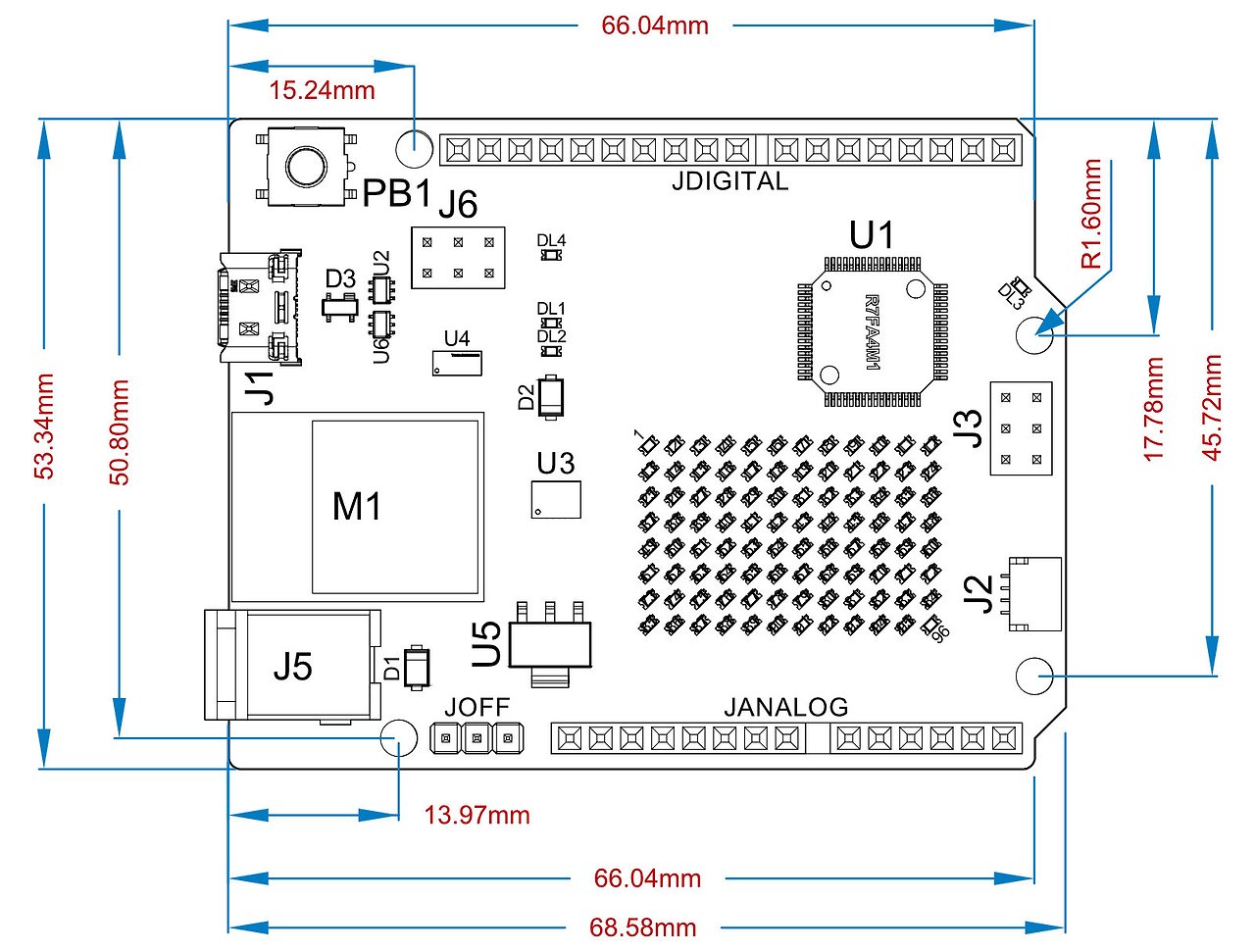 Board Layout: UNO R4 mechanical drawing and board layout.