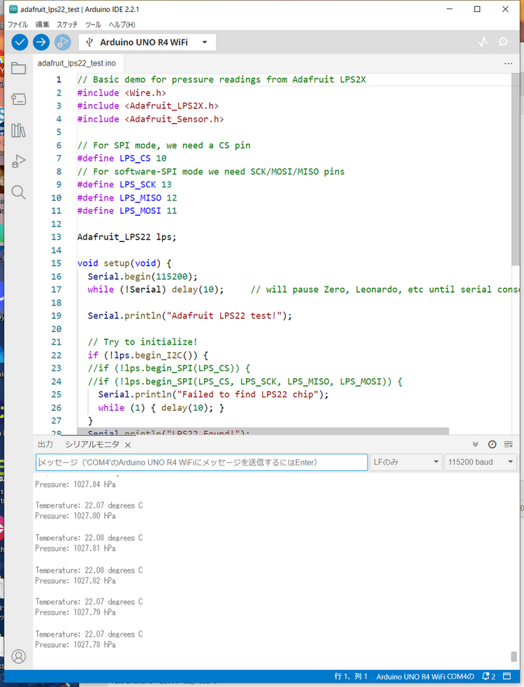 메뉴의 파일->스케치 예제에서 Adafruit LPS2X의 adafruit_lps22_test.ino를 선택한다,