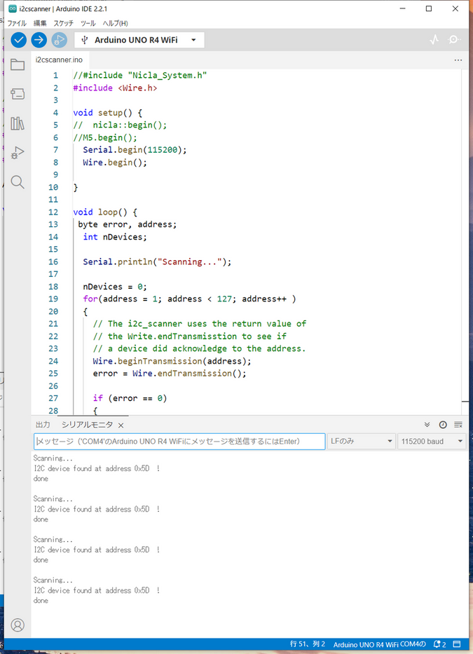 기존에 많이 사용되는 i2cScanner.ino를 실행하여 슬레이브 주소를 확인합니다.
