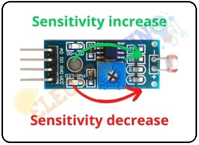 LDR 센서 모듈에는 온보드 가변 저항 또는 포텐셔미터가 있으며, 이 가변 저항은 10k 프리셋입니다. 이 가변 저항은 이 LDR 센서의 감도를 설정하는 데 사용됩니다. 프리셋 노브를 돌려 광도 감지의 감도를 조정합니다. 프리셋 노브를 시계 방향으로 돌리면 광도 감지의 감도가 증가합니다. 시계 반대 방향으로 돌리면 광도 감지의 감도가 감소합니다.
