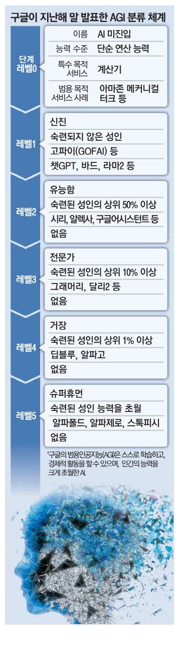 지난해 12월 구글 딥마인드 연구진이 내놓은 'AGI의 레벨'이라는 논문을 통해 AGI 개념이 좀 더 명확해졌죠. 딥마인드는 AGI를 레벨 0부터 5까지 여섯 단계로 나누고 가이드라인을 제시했습니다. 오픈AI 챗GPT, 구글 바드, 메타 라마2 등 인간의 생산성을 드라마틱하게 높여주는 AI 서비스들은 모두 레벨1 수준으로 분류했습니다.