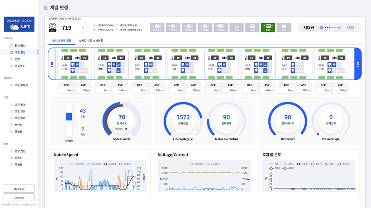 현대로템은 열차 유지보수 외에도 열차 내 각종 데이터를 실시간으로 모니터링해 진단을 용이하게 하는 시각화를 통해 운영자와 유지보수자가 보다 효율적으로 열차를 관리할 수 있도록 인사이트를 제공하고 있습니다. 열차 실시간 모니터링 진단 플랫폼은 데이터 대시보드를 통해 열차의 실내 온도, 승객 수, 점멸 상태, 추진/제동 명령, 가선 전압, 배터리 전압, 주 공기압 등의 정보를 실시간으로 파악해 열차 내 환경을 최적으로 관리합니다.