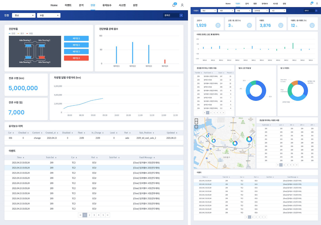 데이터 시각화 및 데이터 대시보드를 통해 관리자는 이 시스템의 문제를 쉽게 파악하고 해결할 수 있습니다. 열차에서 실시간으로 수집되는 수많은 데이터는 수치만으로는 단시간 내에 문제를 파악하기 어렵습니다. 하지만 데이터 전처리와 시각화를 통해 직관적으로 문제를 파악하고 해결할 수 있는 시스템을 구축한 사례입니다. 예를 들어 현대로템은 상태기반 유지보수 시스템 데이터 대시보드에서 진단 구성품의 이벤트 결과, 진단 구성품의 점수, 열차의 주행거리, 진단 구성품의 잔여 수명, 진단 구성품의 정비 이력, 열차 누적 고장 건수, 시스템별 고장 건수, 차량별 고장률, 고장 TOP 10 분석, 위치별 고장 건수 등 다양한 데이터를 쉽게 확인할 수 있습니다. 관리자는 데이터를 시각화한 대시보드를 통해 데이터를 기반으로 열차의 현재 상태를 파악하고 고장 발생 가능성을 예측하여 승객에게 안전한 열차 이용 환경을 제공할 수 있습니다.