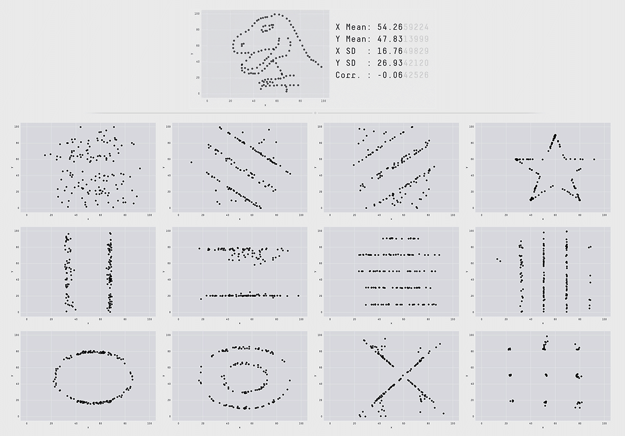 위 그림은 데이터 시각화 분야의 유명인사인 알베르토 카이로의 데이터 세트인 데이터사우루스(Datasaurus, 일반 통계처럼 보이지만 시각화하면 공룡처럼 보이는 데이터 집합)와 소수점 두 자리까지 동일한 요약 통계를 가진 12개의 데이터 세트의 차이를 보여주는 연구 사례입니다. 공룡 형태로 배포된 차트와 아래 12개의 차트는 소수점 둘째 자리까지 평균, 분산, 표준편차 등 주요 지표가 모두 동일한 데이터이지만 소수점 셋째 자리 이하 수치를 변경하여 시각화하면 전혀 다른 패턴이 나타납니다. 이는 숫자로 요약된 통계만으로는 숫자의 정확한 의미를 도출하는 데 한계가 있으며, 시각화해야만 의미 있는 차이를 발견할 수 있다는 메시지를 전달합니다. 이러한 연구 결과를 통해 데이터 시각화는 단순히 데이터를 요약하는 것을 넘어 데이터를 이해하고 활용할 수 있는 인사이트를 제공하는 데 필수적이라는 것을 확인할 수 있습니다.