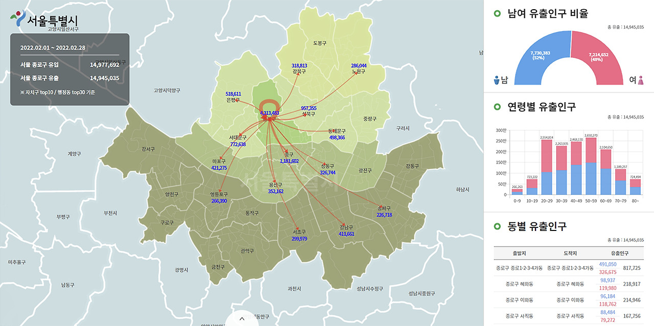 데이터 시각화의 첫 번째 장점은 방대한 양의 데이터를 한눈에 볼 수 있다는 점입니다. 예를 들어 '서울시 생활이동인구 데이터'를 원시 형태로 보면 데이터에서 유의미한 추세를 찾기 어려울 뿐 아니라 검토할 수 없을 정도로 방대한 숫자가 나옵니다. 하지만 이를 시각화하면 데이터 분석 전문가가 아니더라도 시간, 지역, 성별 등 다양한 조건에 따라 서울시의 인구를 한눈에 파악할 수 있습니다.