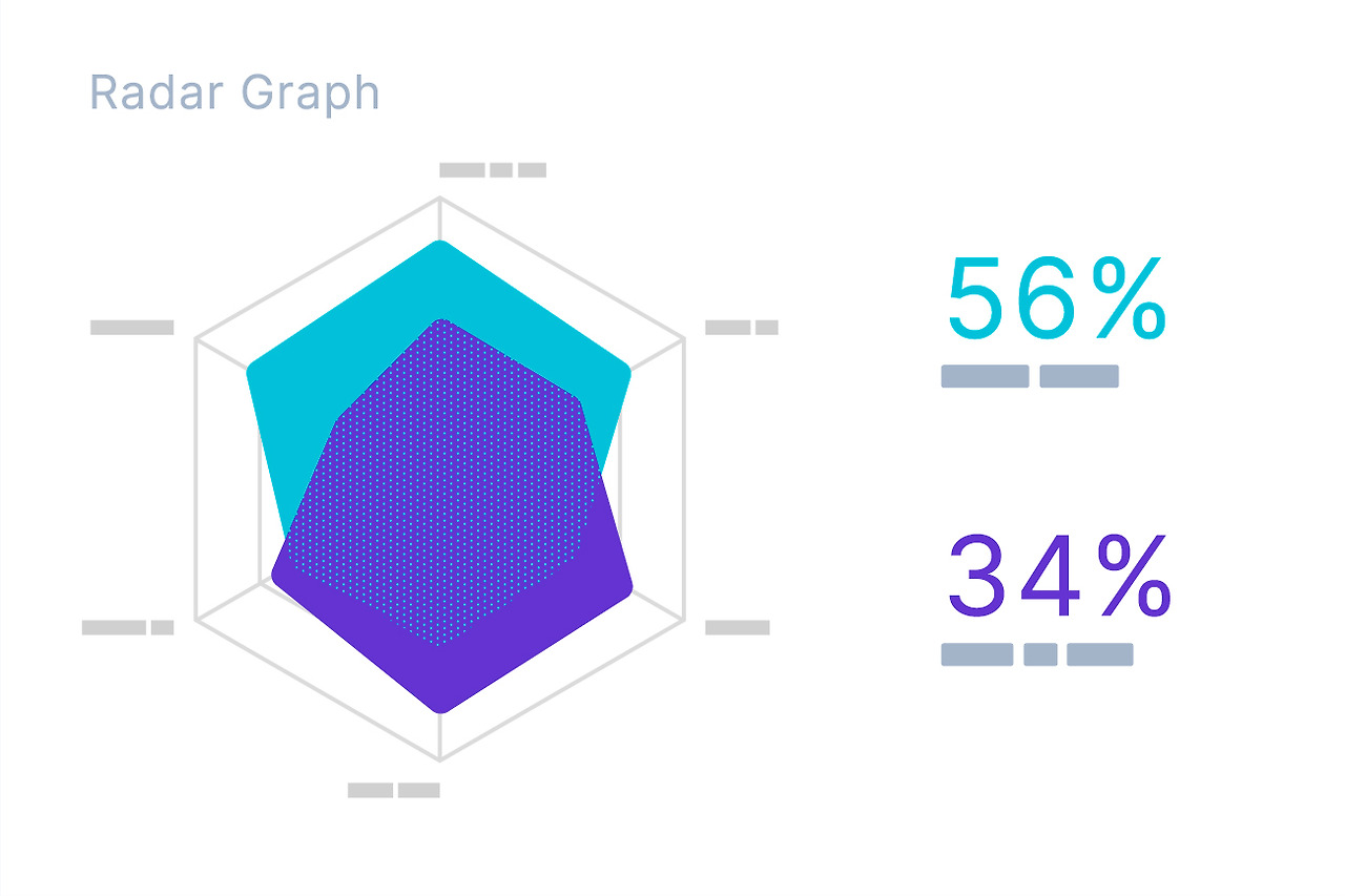 레이더 차트는 평가 항목이 여러 개일 때 항목 수에 따라 원을 나누고 중앙에서 일정한 간격으로 눈금을 측정하여 각 평가 항목의 정량화된 값에 따라 해당 위치에 점을 그리고 선을 만들어 항목 간의 균형을 한 눈에 볼 수 있도록 한 차트입니다. 예를 들어 특정 제품의 품질을 평가하기 위해 디자인, 가격, 편의성, 독창성 등에 점수를 매겨 레이더 차트로 그리면 제품의 특성을 한눈에 파악하기 쉽습니다. 게임 캐릭터나 운동선수의 능력을 표현할 때도 자주 사용됩니다.