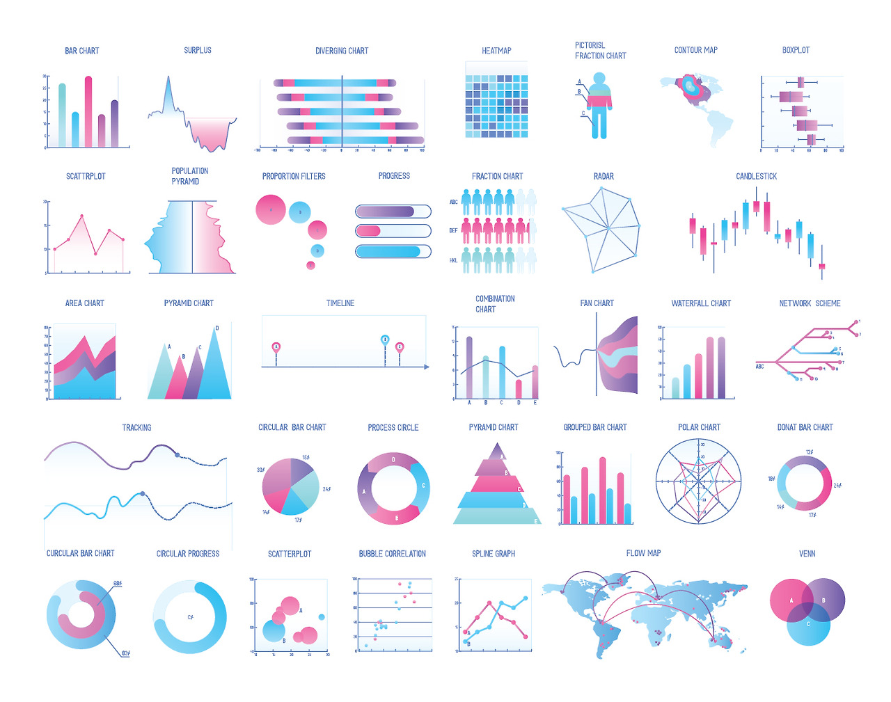 데이터 시각화에는 다양한 유형이 있습니다. 데이터의 의미를 더 쉽게 찾고 이해할 수 있도록 도와줍니다. 대표적인 유형으로는 막대형 차트, 꺾은선형 차트, 영역형 차트, 도넛형 차트, 분산형 차트, 거품형 차트, 방사형 차트, 프레임 다이어그램, 깔때기형 차트, 간트형 차트 등이 있습니다.