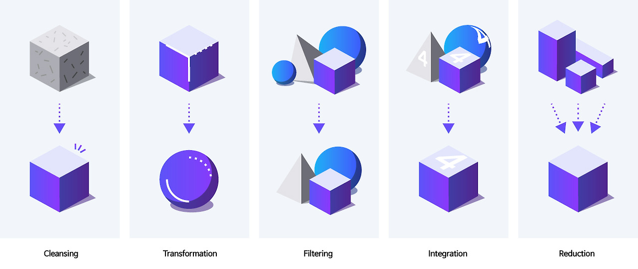 빅데이터를 잘 활용하려면 어떻게 해야 할까요? 빅데이터에 가치를 더하기 위해서는 먼저 데이터 전처리와 데이터 시각화라는 두 단계를 거쳐야 합니다. 데이터 전처리는 데이터를 기술적으로 수집하고 정제하는 데이터 처리 단계부터 분석 기법을 활용한 데이터 분석에 이르는 과정에 필요한 기술입니다. 방대한 양의 원시 데이터를 분석 목적과 분석 방식에 적합한 형태로 가공하는 과정입니다.