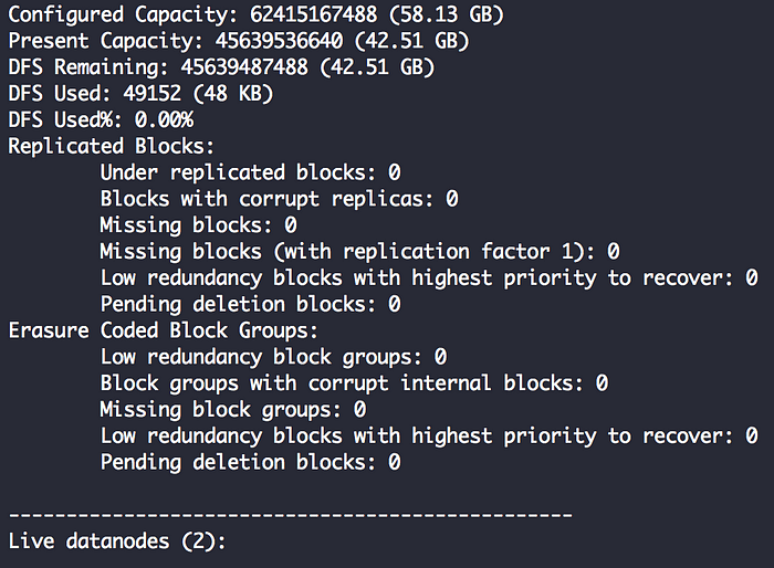 마지막 단계에서 문제가 없었다고 가정하고 ./bin/hdfs dfsadmin -report를 입력하여 클러스터의 상태를 확인할 수 있습니다(라이브 데이터 노드 수를 관찰합니다).