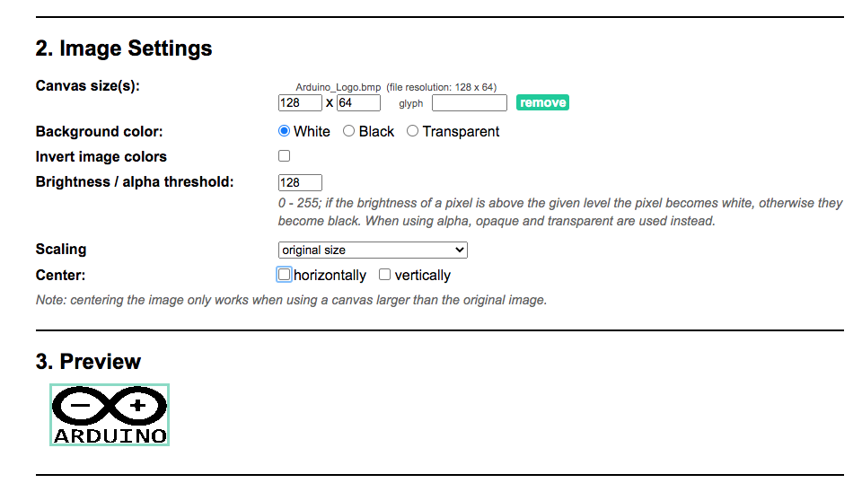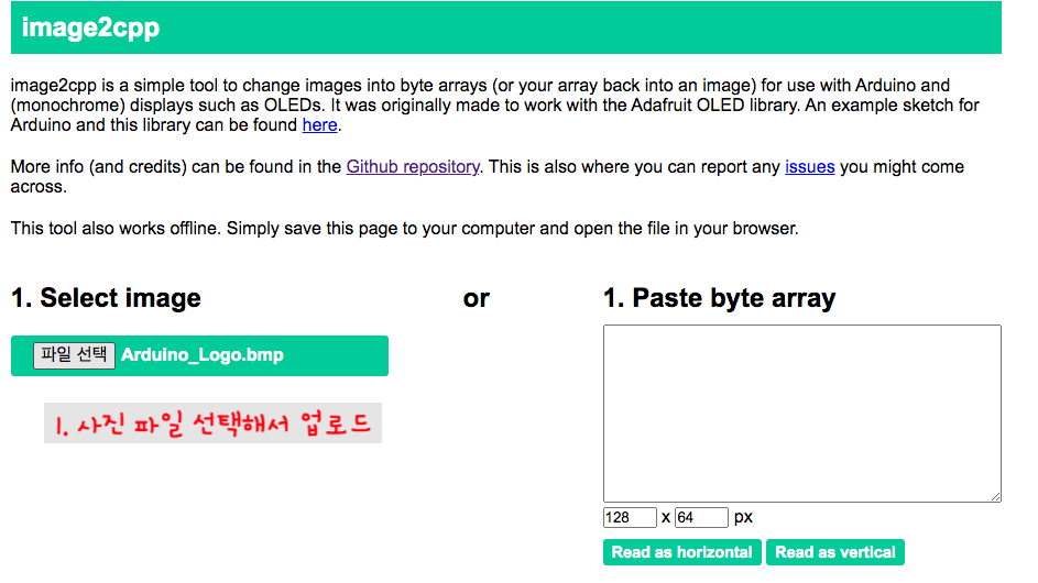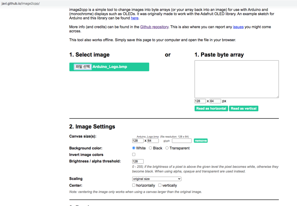 image2cpp라는 온라인 프로그램을 사용하면 손쉽게 이미지를 바이트 배열로 변환할 수 있습니다. 주소는 여기( http://javl.github.io/image2cpp/ )로 접속하시면 됩니다.. 이 프로그램을 사용하면 우리가 원하는 이미지를 손쉽게 바이트 배열로 바꿀 수 있을 뿐만아니라 이미지 색상반전, 밝기조절, 아두이노 코드로 출력하기 등의 추가 기능도 제공합니다.