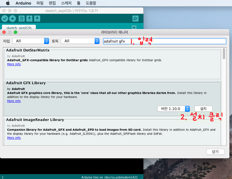 그리고 아래그림과 같이 라이브러리 매니저가 뜨면 adafruit gfx 라고 입력하고 해당 라이브버리를 설치해 줍니다. 이 라이브러리는 adafruit의 디스플레이 모듈의 그래픽 관련 처리를 도와주는 라이브러리라고 합니다. adafruit의 ssd1306의 동작에도 활용되기 때문에 설치가 필요합니다.