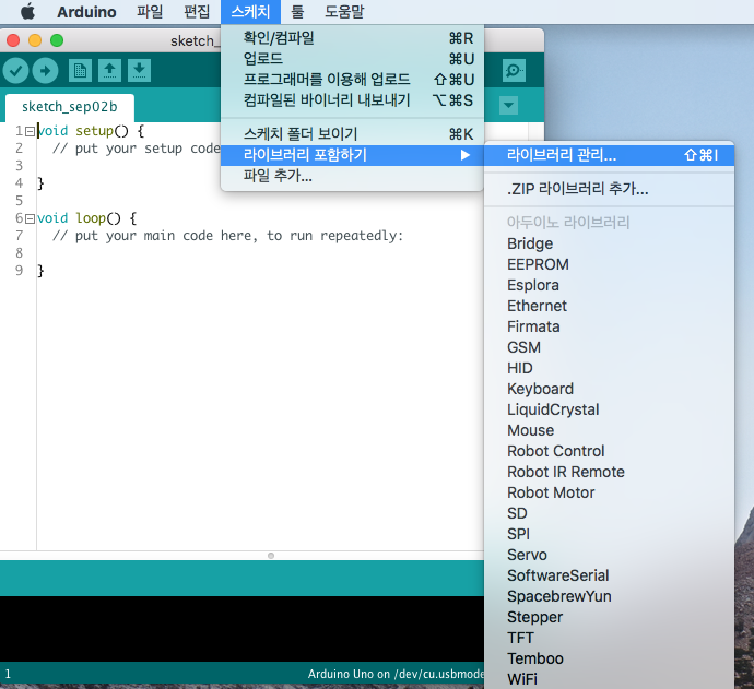 우선 라이브러리 설치를 위해 [스케치]-[라이브러리 포함하기]-[라이브러리 관리]를 눌러 줍니다.
