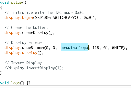 비트맵이미지를 OLED에 표시하기 위해서는 drawBitmap( ) 이라는 함수를 사용하면 되는데요. 이 함수는 6개의 파라미터를 필요로 합니다. 파라미터는 각각 비트맵 이미지의 왼쪽위 모서리의 x좌표, y좌표, 비트맵이미지의 바이트 배열, 비트맵이미지의 가로길이, 비트맵이미지의 세로길이, 색상 입니다. 우리는 128x64픽셀의 이미지를 사용했기 때문에 X, Y 좌표는 0, 0을 너비와 길이에는 128, 64를 각각 입력한 것입니다.