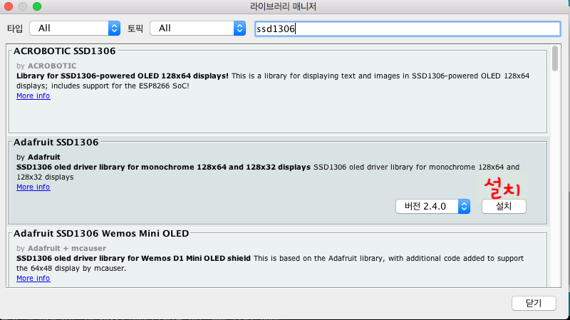두번째로 adafruit ssd1306라이브러리를 설치해 줍니다. 아래 사진과 같이 adafruit ssd1306을 입력해 해당 라이브러리를 설치하면 됩니다.