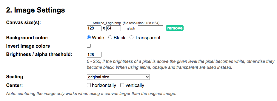 그다음으로 이미지 세팅에서 사진사이즈는 128x64로 지정해 주고 배경색상을 지정해 줍니다.