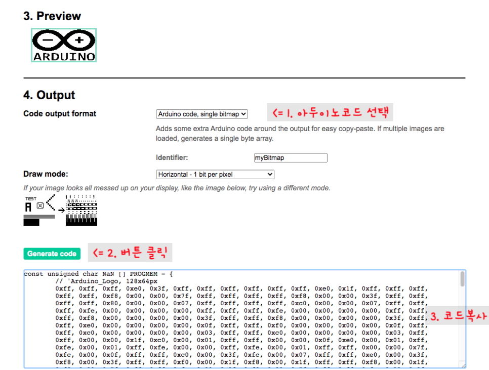3. Preview를 통해 미리보기 기능도 제공이 되는데요. 이상이 없으면 4번에서 Code output format을 Arduino code로 선택하고 generate code 버튼을 눌러줍니다. 그럼 아래에 바이트 배열 코드가 생성이 됩니다.