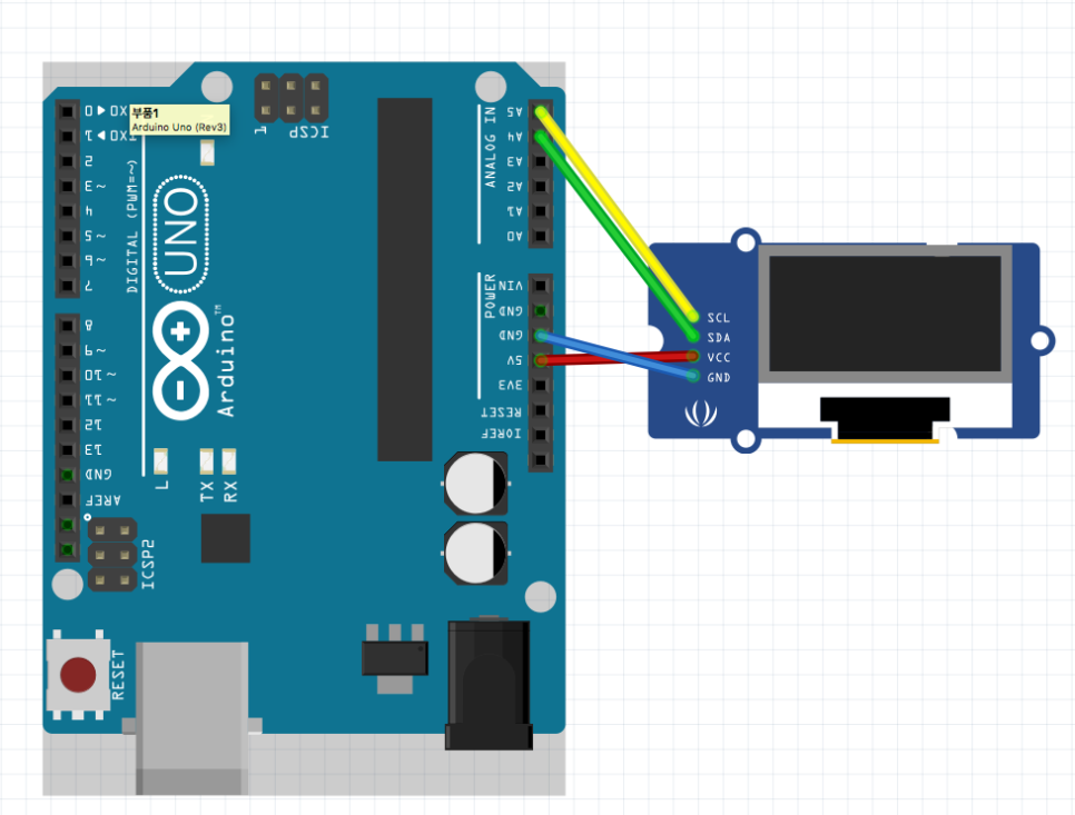 아두이노버전에 따라 I2C 연결용 핀이 다르기 때문에 사용하시는 아두이노 모델에따라 OLED 모듈의 SCL, SDA핀을 아두이노의 SCL, SDA핀과 연결하면 됩니다.