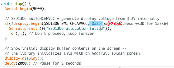 스케치 파일에 보면 display.begin( )함수에 주소가 0x3D로 기본으로 설정되어 있는데 자신이 사용하는 모듈의 I2C주소로 바꿔 줘야 합니다. 이번 포스팅에서 사용한 모듈은 I2C 주소가 0x3C이기 떄문에 아래와 같이 0x3C로 바꿔주면 됩니다.