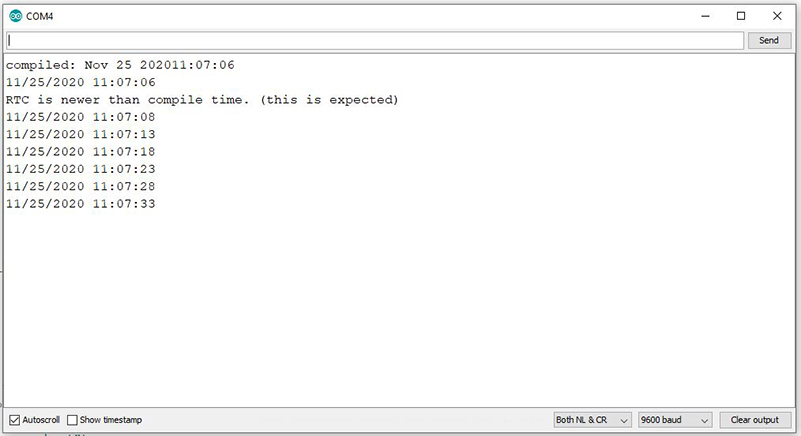 이 코드에서는 처음에는 시간 정보가 모듈에 시작점으로 제공됩니다. 그런 다음 모듈이 작동을 시작하고 5초마다 업데이트된 시간이 직렬 모니터에 표시됩니다. 예상되는 출력은 다음과 같습니다: