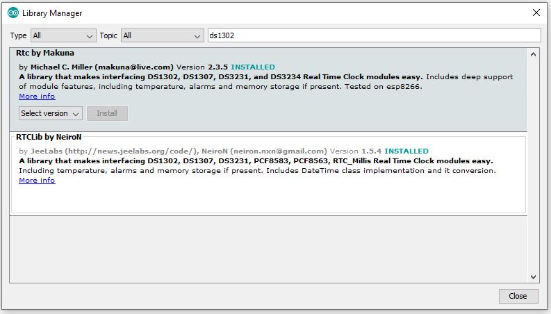 DS1302RTC 모듈을 동작하기 위해 라이브러리가 설치 되어야 합니다. 라이브러리 관리자로 이동하여 Makuna의 Rtc 라이브러리를 설치합니다.