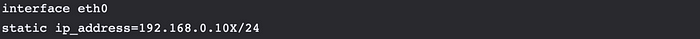 Pis에 설정한 정적 ip_address는 라우터의 ip_address와 일치해야 한다는 점에 유의하세요. 예를 들어 라우터의 ip_address는 192.168.1.10X/24에서 시작하므로 각 Pi에 아래에 표시된 ip_address를 할당합니다.