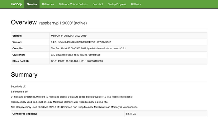 모든 Pi에서 HDFS에 파일을 넣고(hadoop fs -put 사용) 다른 Pi에 표시되는지 확인하여 클러스터를 테스트할 수 있습니다(hadoop fs -ls 사용). 웹 브라우저를 열고 http://192.168.1.101:9870/(저희의 경우)으로 이동하여 클러스터가 실행 중인지 확인할 수도 있습니다. 이 웹 인터페이스는 파일 탐색기와 클러스터 상태에 대한 정보를 제공합니다.