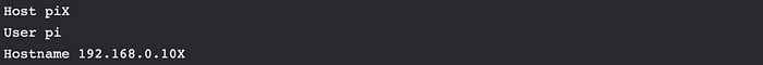 X를 각 Pi의 번호로 바꿉니다. 이 작업은 단일 Pi에서 수행되므로 한 Pi는 ~/.ssh/config 내의 모든 코드 청크를 가져야 하며, 이는 네트워크의 각 Pi마다 변경해야 하는 X 문자를 제외하고는 위와 동일하게 보입니다.