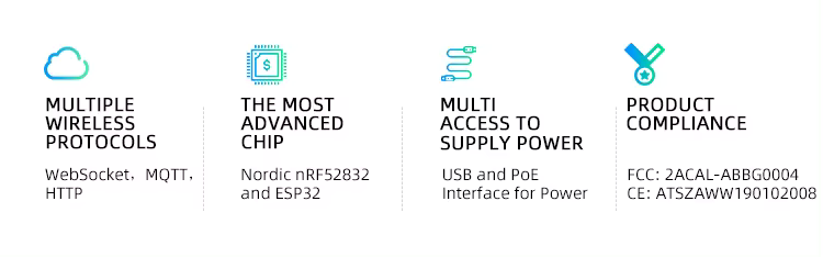 여러 무선 프로토콜 여러 무선 프로토콜 지원됩니다 AB BLE 게이트웨이 V4 포함 WebSocket, MQTT, HTTP; |