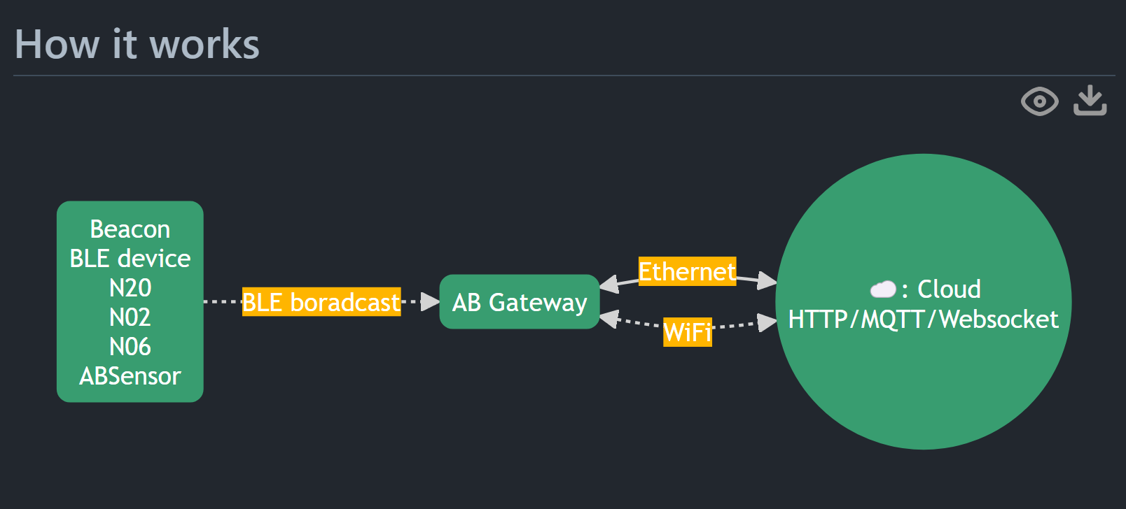 | Features Ethernet and Wi-Fi Connectivity Support WebSocket/HTTP/MQTT protocol External antenna for BLE Reads multiple BLE devices in the same time and upload to remote server User-Friendly Configuration Tool: The Gateway comes with a user-friendly configuration tool that provides a graphical interface for easy setup. How it works: 아래 이미지 참고 Applications iBeacon/Eddystone/tag receiver for location tracking BLE sensor reader for sensor network Building automation Health and wellness monitoring Cycling, biking Security Location tracking Access management Advertisement Industrial automation Indoor Location Meeting sign in Check in Parking & Checking in Home automation Certifications FCCID: 2ACAL-ABBG0004 CE No.: ATSZAWW190102008 |