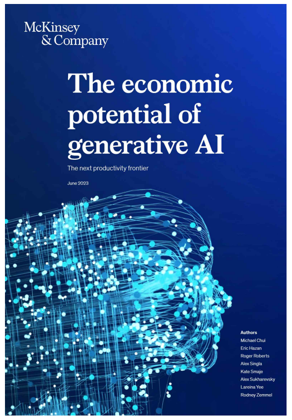 1. 생산성에 대한 제너레이티브 AI의 영향은 전 세계 경제에 수조 달러의 가치를 더할 수 있습니다. 최근 연구에 따르면 제너레이티브 AI는 분석 대상인 63개 사용 사례에서 연간 2조 6천억 달러에 서 4조 4천억 달러에 해당하는 가치를 추가할 수 있는 것으로 추정됩니다. 이에 비해 2021년 영 국의 전체 GDP는 3조 1천억 달러였습니다.