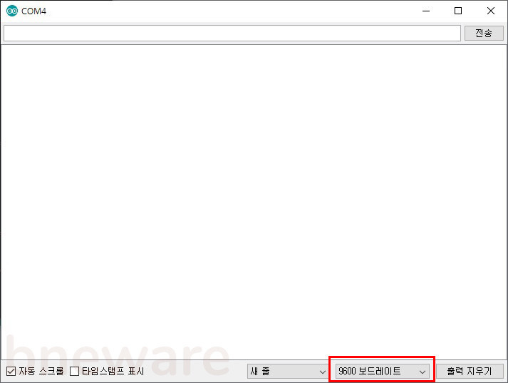 시리얼 모니터가 나타나면 보드레이트를 "9600" 으로 설정 합니다