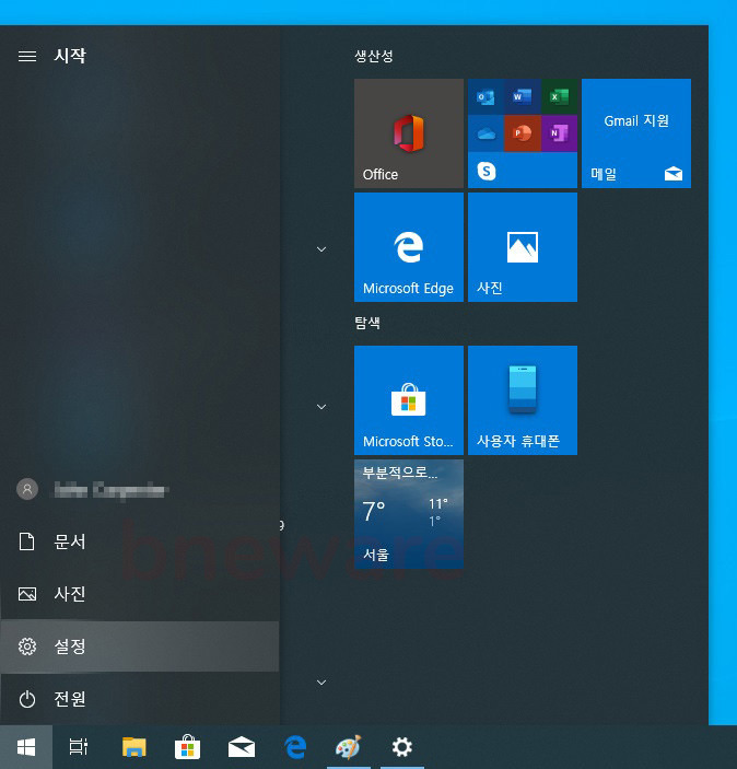 "윈도우 키" 를 클릭하고 "설정" 을 클릭합니다