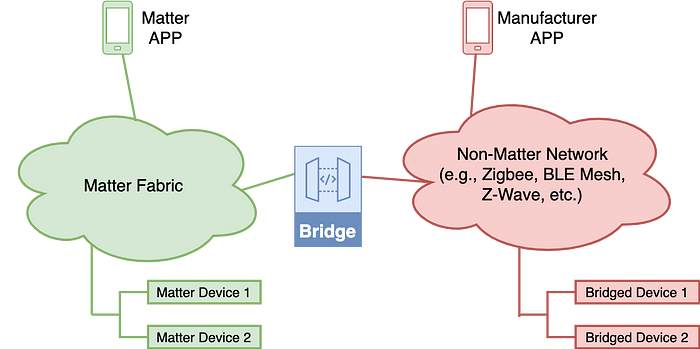 비Matter 기기는 Matter 생태계의 노드에 Bridged Device로 노출됩니다. Bridge 기기는 Matter와 다른 프로토콜 간의 변환을 수행하여 Matter 노드가 Bridged Device와 통신할 수 있도록 합니다.