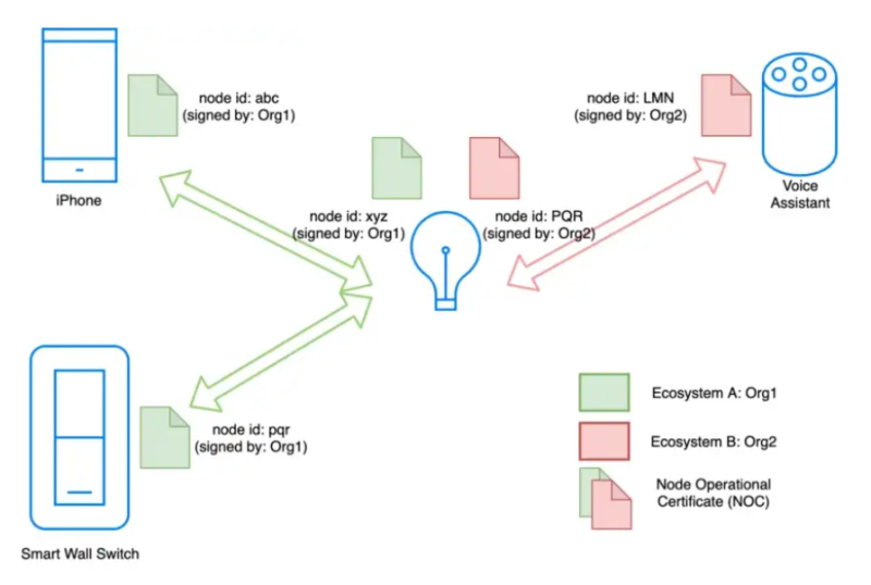 Matter 노드가 여러 생태계에 속하는 경우 이러한 노드 운영 인증서가 여러 개 있습니다(지원하는 각 생태계에 대해 하나씩). 아래 다이어그램에서 알 수 있듯이 전구에는 NOC가 두 개 있으므로 노드 식별자가 두 개 있습니다. 녹색 생태계의 경우 xyz이고 빨간색 생태계의 경우 PQR입니다.