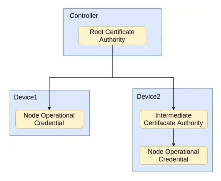 NOC는 중간 인증 기관(ICA)에서 서명하거나 루트 인증 기관(RCA)에서 직접 서명할 수 있습니다. RCA는 일반적으로 커미셔너에서 생성합니다. 시운전 프로세스 중에 NOC와 RCA가 장치에 설치됩니다.