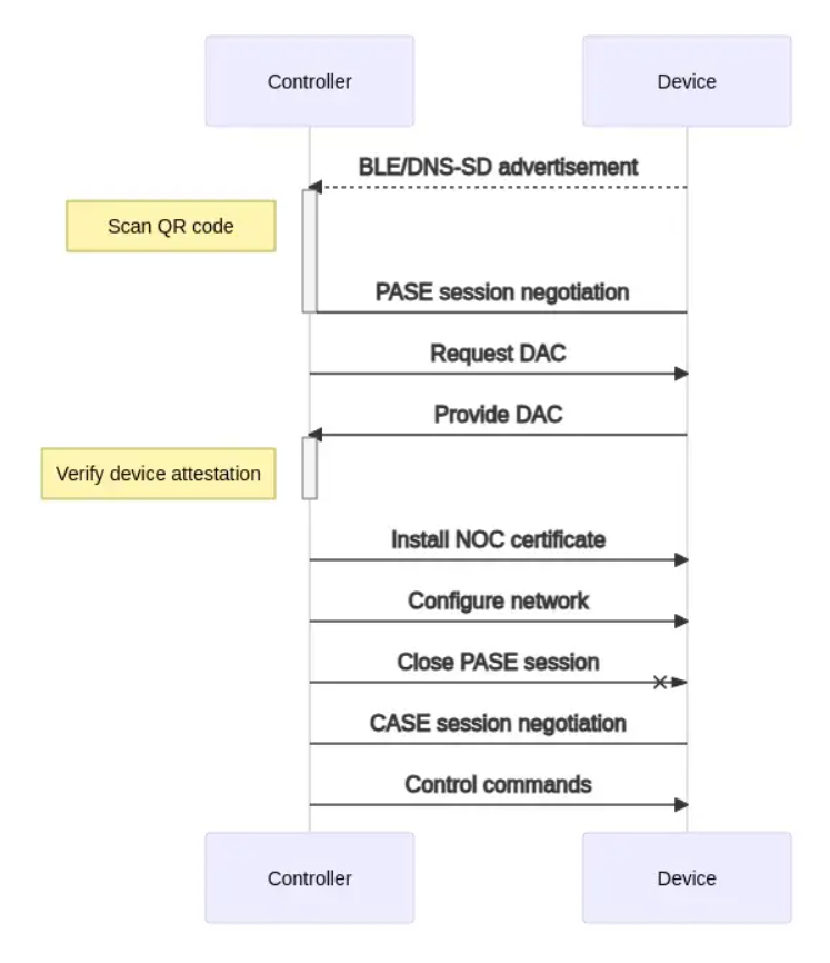 장치에 전원이 공급되면 BLE 광고 또는 DNS-sd 서비스 광고를 통해 자체를 광고합니다. 컨트롤러가 광고를 수신하면 페어링 코드를 기반으로 장치와 암호화된 세션을 설정하려고 시도합니다. 이 프로세스를 Matter에서는 PASE(Password Authenticated Session Establishment)라고 합니다. 일반적으로 앱은 PASE 프로세스에서 QR 코드를 스캔하여 장치의 고유한 페어링 코드를 검색합니다.